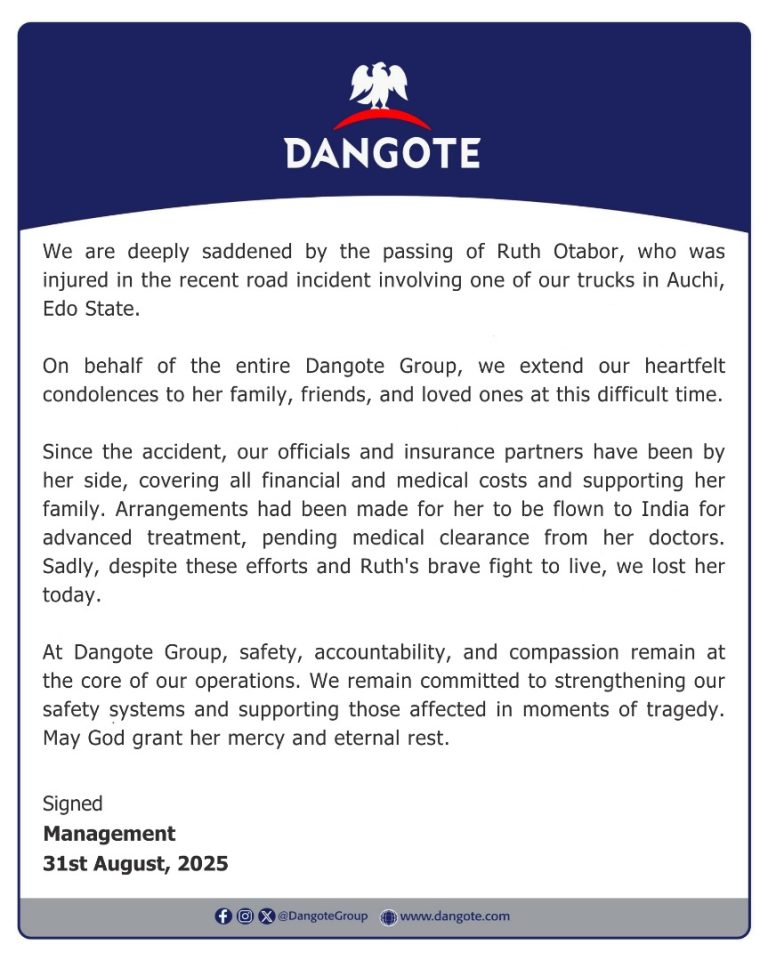 “We are deeply saddened by the passing of Ruth Otabor, who was injured in the recent road incident involving one of our trucks in Auchi, Edo State. On behalf of the entire Dangote Group, we extend our heartfelt condolences to her family, friends, and loved ones at this difficult time,” the statement read.